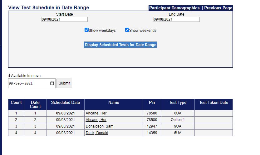 This screen shows who is testing that day. You can who is testing on different days by selecting the start date and end date at the top of the screen